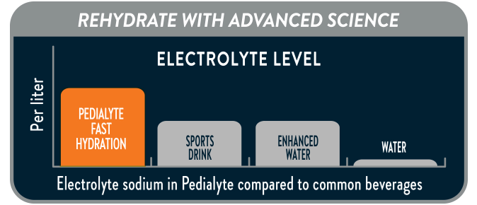 * Pedialyte Fast Hydration liter has 1080mg sodium and 14g sugars per liter; leading sports drink has ~460 sodium and ~58g sugars per liter.